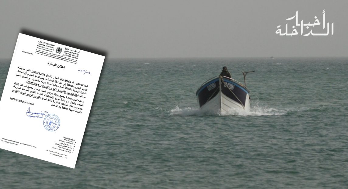 أعلنت مندوبية الصيد البحري بالداخلة، أن سواحل الدائرة البحرية بالداخلة تشهد حاليًا أحوالًا جوية مضطربة، مع تسجيل تحسن نسبي مرتقب خلال اليومين القادمين، الأحد والاثنين 4 و5 يناير 2026. وأوضحت…