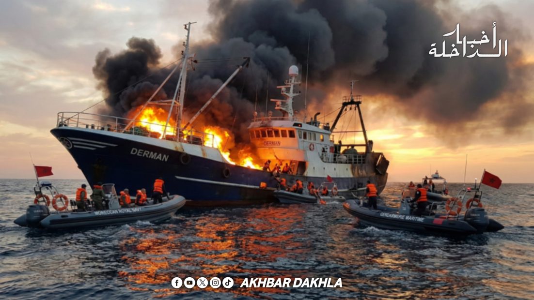 حريق مهول على متن سفينة صيد قبالة سواحل الداخلة